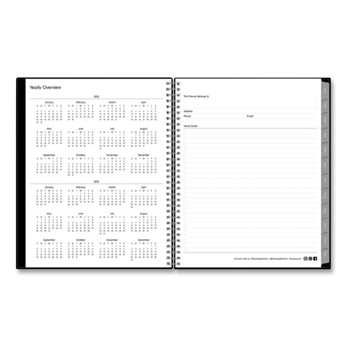 The professional exterior you’re looking for, with the interior content you rely on to manage your workweek and everyday scheduling. This 11″ x 8.5″ appointment-style planner allows you to jot down appointments with 15-minute increment time slots on the weekly calendar pages over a two-page spread. Use the open notes column for reminders and more. Plus navigate your month with the two-page monthly view spread. Twin-wire binding and durable, coated tabs offer easy page turning and access to past, present and future months. Includes a Yearly Goals page, Contacts, Important Dates, five Notes pages, plus years of Holidays.
