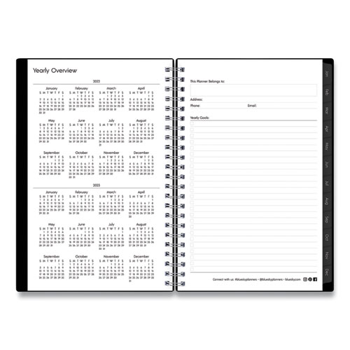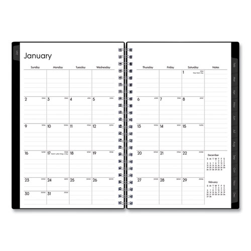 The professional exterior you’re looking for, with the interior content you require. Easily plan out your year and stay on track every month, every week, every day along the way with the stylish Enterprise Weekly/Monthly Planner. One week per two-page spreads provide plenty of space for your daily schedule throughout the week, Monday through Sunday. Monthly spreads feature a standard daily block format with reference calendars and space for month-spanning notes, giving you everything you need for longer-range planning tasks. Durable, coated monthly tabs offer quick access to past, present and future months. Additional resources in the back of the book help you plan out your year and keep everything on track. Flexible cover and snag-free twin-wire binding ensure everything stays neatly together. Thick, premium, acid-free pages are printed entirely with soy-based inks.