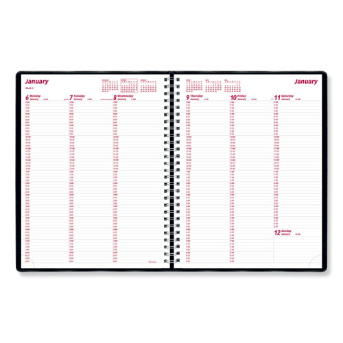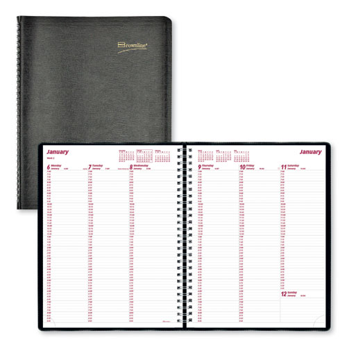 Product Details** Global Product Type Appointment Book/Personal Organizers Dated Yes Academic Year No Calendar Format Weekly Edition Year 2025 Calendar Term 12-Month (Jan to Dec) Binding Type Wire-O Color Family Black Refillable No Calendar Spread Format One Week per Two-Page Spread Julian Dates Yes Size (Bound-Side First) 11 x 8.5 Binding Details Twin-Wire: Flexible Cover Cover Theme Traditional Cover Color(s) Black Cover Material(s) Lizard-Look Synthetic Leather Binding Color(s) Silver Page Theme Traditional Appointment Ruling 15-min, 7 AM to 8:45 PM (Mon-Fri),15-min, 7 AM to 5:45 PM (Sat),Open Scheduling (Sun) Calendar Reference Blocks One Past Month,Current Month,Four Future Months Separate Sections Current Year Quarterly Planners,Future Year Quarterly Planners,Interest Calculation Table,List of Important Dates,Measurement Standard/Metric Conversion Table,Personal Information Page,Telephone & Address Section,Temperature Celsius/Fahrenheit Conversion Table Sheets per Calendar/Planner 132 Sheet Color(s) White/Burgundy Reversible No Seasonal Availability Yes Product Biodegradability Indicator N Product Biodegradability in Days 0 Product Compostability Indicator N Green Information Printed with vegetable-oil-based ink. Acid-free paper. Processed Chlorine Free (PCF). PVC-free. Pre-Consumer Recycled Content Percent 0% Post-Consumer Recycled Content Percent 50% Total Recycled Content Percent 50% Disclaimer Statement This product was made using wood sourced from a certified managed forest. Country Of Origin CA Carton Weight 34 lbs. Carton Pack Quantity 40 EA Pack Quantity 0 UPC 069775667962 UNSPSC 44112005 Shipping Weight & Item Dimensions Weight 0.825 lbs. Length 11.38 in Height 0.44 in Width 9.25 in