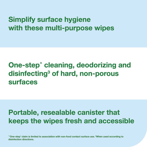 Simplify surface hygiene tasks with these multipurpose disinfecting and cleaning wipes. The Everwipe by Tork disinfectant wipes kill 99.9% of germs, and kill cold and flu viruses. These disposable disinfecting wipes come in a portable, resealable canister that keeps them fresh and easily accessible whenever you need them.