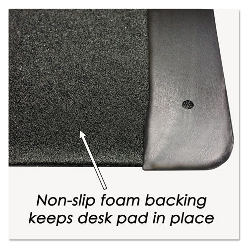 Protect your desk from scratches, stains and spills. Ergonomic desk pad enables smoother writing, while the handsome leather-like side panels provide space for cards, notes and memos. The center panel resists stains and cleans easily with water. Built-in antimicrobial agent protects the product from the growth of germs. Writing surface made from recyclable material.