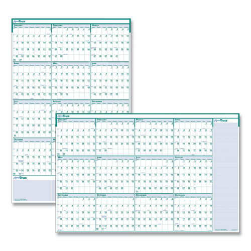 Reversible yearly wall planner features a horizontal format on one side and a vertical format on the reverse to best fit any workspace. Heavy-laminated write-on, wipe-off surface erases clean with a damp cloth, making it easy to change notes and plans. Teal printing on white background helps your notes stand out. Generous open note space for business goals and priorities and numbered weeks. Includes one black, water-soluble marker and hanging tabs. Calendar is printed on 100% recycled paper with soy inks.