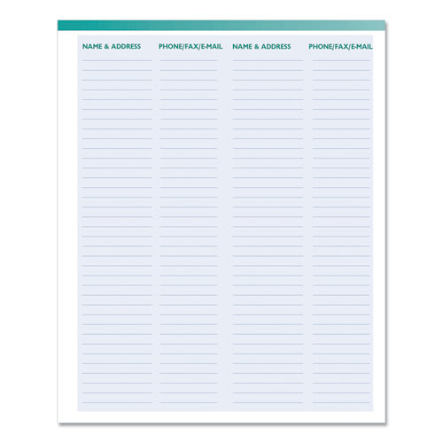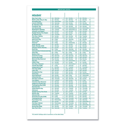 Product Details** Global Product Type Appointment Book/Personal Organizers Dated Yes Academic Year No Calendar Format Weekly/Monthly Edition Year 2025 to 2026 Calendar Term 13-Month (Jan to Jan) Binding Type Wire-O Color Family Black Refillable No Calendar Spread Format One Week per Two-Page Spread,One Month per Two-Page Spread Julian Dates Yes Size (Bound-Side First) 8 x 5 Binding Details Twin-Wire: Soft Cover Cover Color(s) Black Cover Material(s) Embossed Simulated Leather Appointment Ruling 60-min, 8 AM to 5 PM (Mon-Fri),Open Scheduling (Sat-Sun) Calendar Reference Blocks Weekly: Past Month, Current Month, Two Future Months,Monthly: Two Past Months, Four Future Months Separate Sections Memo,Three-Year Reference Calendar Page,Tips for Prioritizing and Setting Goals,Three-Year Holiday List,Name/Address,Standard World Time Sheet Color(s) White/Teal/Gray Pocket Details Double-Sided Storage Pocket Reversible No Seasonal Availability Yes Product Biodegradability Indicator N Product Biodegradability in Days 0 Product Compostability Indicator N Pre-Consumer Recycled Content Percent 0% Post-Consumer Recycled Content Percent 100% Total Recycled Content Percent 100% Disclaimer Statement This product was made using wood sourced from a certified managed forest. Footnote 1 Four-month calendar reference blocks on weekly spread and five-month reference blocks on monthly overview Country Of Origin US Carton Weight 6 lbs. Carton Pack Quantity 10 EA Pack Quantity 0 UPC 040983202763 UNSPSC 44112005 Shipping Weight & Item Dimensions Weight 0.406 lbs. Length 8.1 in Height 0.5 in Width 5.3 in