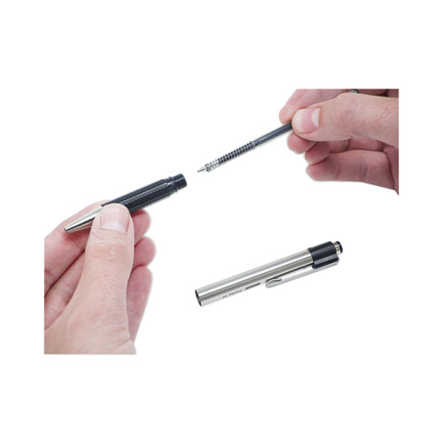 Product Details** Global Product Type Ballpoint Pens Pen Style Retractable Pen Tip Type Conical Pen Point Size Type Fine Color Family Black Erasable Ink No Refillable Yes Pen Sub-Brand & Product Family F-301® Pen Type Ballpoint Pen Pen Point Size 0.7 mm Pen Ink Color(s) Black Pen Barrel Color(s) Stainless Steel/Black Airplane-Safe Ink Yes Low-Viscosity Ink No Pen Grip Type Non-Slip Rubber Visible Ink Supply No Pocket Clip Indicator Yes Product Biodegradability in Days 0 Pre-Consumer Recycled Content Percent 0% Post-Consumer Recycled Content Percent 0% Total Recycled Content Percent 0% Country Of Origin ID Carton Weight 12 lbs. Carton Pack Quantity 144 PK Pack Quantity 2 EA UPC 045888271128 UNSPSC 44121704 Shipping Weight & Item Dimensions Weight 0.069 lbs. Length 7.5 in Height 0.5 in Width 2.25 in