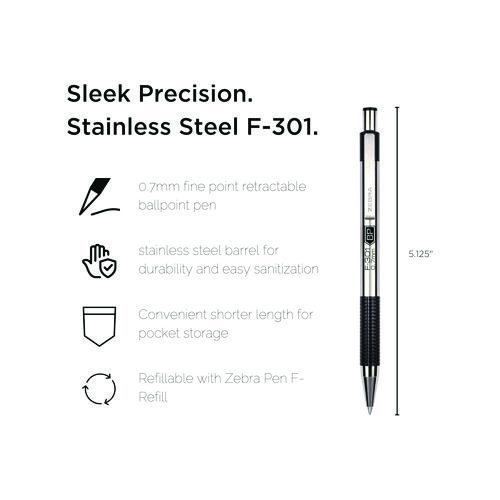 Product Details** Global Product Type Ballpoint Pens Pen Style Retractable Pen Tip Type Conical Pen Point Size Type Fine Color Family Black Erasable Ink No Refillable Yes Pen Sub-Brand & Product Family F-301® Pen Type Ballpoint Pen Pen Point Size 0.7 mm Pen Ink Color(s) Black Pen Barrel Color(s) Stainless Steel/Black Airplane-Safe Ink Yes Low-Viscosity Ink No Pen Grip Type Non-Slip Rubber Visible Ink Supply No Pocket Clip Indicator Yes Product Biodegradability Indicator N Product Biodegradability in Days 0 Product Compostability Indicator N Pre-Consumer Recycled Content Percent 0% Post-Consumer Recycled Content Percent 0% Total Recycled Content Percent 0% Country Of Origin ID Carton Weight 36 lbs. Carton Pack Quantity 96 DZ Pack Quantity 0 UPC 045888271104 UNSPSC 44121704 Shipping Weight & Item Dimensions Weight 0.35 lbs. Length 5.75 in Height 1.22 in Width 2.71 in