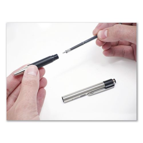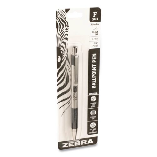 Product Details** Global Product Type Ballpoint Pens Pen Style Retractable Pen Tip Type Conical Pen Point Size Type Fine Color Family Black Erasable Ink No Refillable Yes Pen Sub-Brand & Product Family F-301® Pen Type Ballpoint Pen Pen Point Size 0.7 mm Pen Ink Color(s) Black Pen Barrel Color(s) Stainless Steel/Black Archival-Quality Ink No Airplane-Safe Ink No Low-Viscosity Ink No Pen Grip Type Non-Slip Rubber Visible Ink Supply No Pocket Clip Indicator Yes Manufacturer Pen Refill # 85512 Product Biodegradability Indicator N Product Biodegradability in Days 0 Product Compostability Indicator N Pre-Consumer Recycled Content Percent 0% Post-Consumer Recycled Content Percent 0% Total Recycled Content Percent 0% Country Of Origin ID Carton Weight 7 lbs. Carton Pack Quantity 144 EA Pack Quantity 0 UPC 045888271111 UNSPSC 44121704 Shipping Weight & Item Dimensions Weight 0.03 lbs. Length 0.49 in Height 7.5 in Width 2.25 in