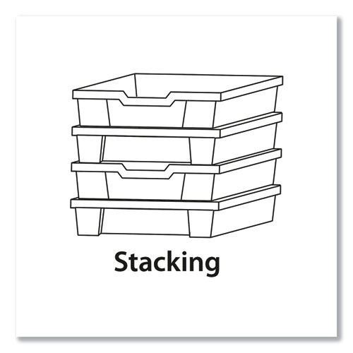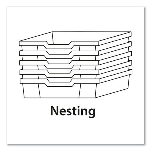 Iconic, Worlddidac award-winning F1 Shallow Trays are found in learning environments all over the world. Made of fully recyclable materials, each tray is molded to a standardized size for seamless integration into Gratnells Storage Frames and Trolleys, so you can easily reconfigure your bins and resource areas to the unit or project at hand. With enough foresight, you can even color-code accordingly. Loved by teachers and students alike, these strong, rigid bins are all BSI approved for heavy educational use. Semi-fire-retardant (0.22 mm per minute), anti-static, talc-filled polypropylene construction ensures high-resistance to a variety of chemicals and contaminants, making it a superior choice over ABS in almost any environment, doubly so in science labs as well as art, shop and electronics classrooms. Whether it’s art or science-lab supplies, whether it’s worksheets or robotics kits, there’s a tray to meet your needs. Stackable and nestable with built-in carry handles, these bins are also compatible with a variety of available dividers and lids (lids and dividers sold separately).