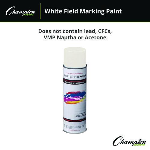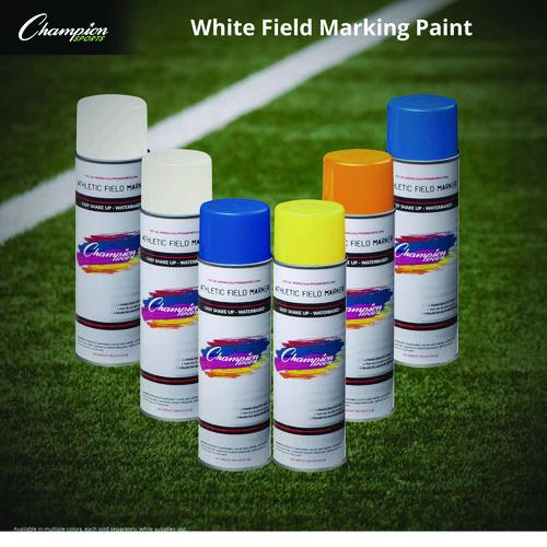 Champion Sports Field Marking Paint aerosol delivers a single-coat coverage, quick drying, and crisp clear lines onto the field. The unique aerosol tip was made for all stripping machines, but also manual hand output as well. Make fast-drying vibrant and sharp 3″ to 6″W stripes. Each paint was manufactured to last until 135 yds of stripe and not to stain clothing when applied. The Field Marking Paint is non-clogging, water-resistant, and contains no CFC’s, VMP Naptha, or Acetone.