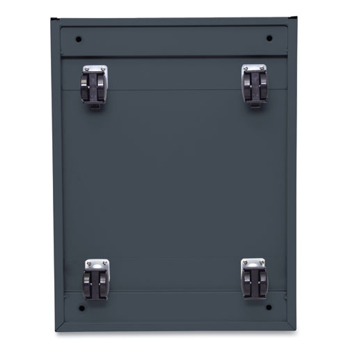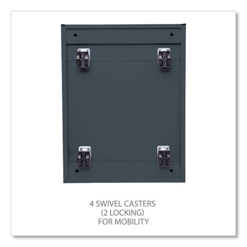 Product Details** Global Product Type Vertical Desk Pedestals Number of Drawers 2 Drawer Configuration File Anti-Tip Mechanism Indicator Yes Color Family Gray Pedestal Sub-Type Indicator Yes Caster Indicator Yes Anti-Tip Mechanism Counterweight Color(s) Charcoal Pedestal Count 1 Pedestal Orientation Left/Right Pedestal Types Freestanding: Full-Height Overall Width 14.96″ Overall Depth 19.29″ Overall Height 27.75″ Height Without Casters 26.38″ Base Material Steel Top Material Steel Caster Details Two Locking Swivel Casters,Two Non-Locking Swivel Casters Glide/Feet Indicator No Document Size Accommodation Legal,Letter Drawer Height-File Drawer 12″ Product Biodegradability in Days 0 Compliance Standards Meets or Exceeds ANSI/BIFMA Standards Pre-Consumer Recycled Content Percent 0% Post-Consumer Recycled Content Percent 0% Total Recycled Content Percent 0% Special Features File/File Format-Two 12″ high file drawers. Country Of Origin TW Carton Weight 73 lbs. Carton Pack Quantity 1 EA Pack Quantity 0 UPC 042167600266 UNSPSC 56101708 Shipping Weight & Item Dimensions Weight 72.31 lbs. Length 29.33 in Height 18.5 in Width 22.83 in Warranty Manufacturer’s limited five-year warranty.