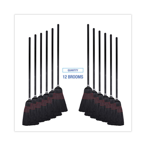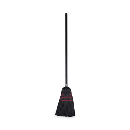 Convenient size janitorial or housekeeping broom for light-duty sweeping. Stiff, tightly packed bristles get into nooks and crannies while pushing dust and debris. Composed of a wooden handle with flagged-tip, polypropylene bristles for added durability. The four rows of stitching and metal wrapping provided strength and dependability. Black color blends seamlessly into contemporary environments. Lightweight and portable for added mobility. Great for hotels, restaurants, lobbies, and household sweeping on a variety of floor types.