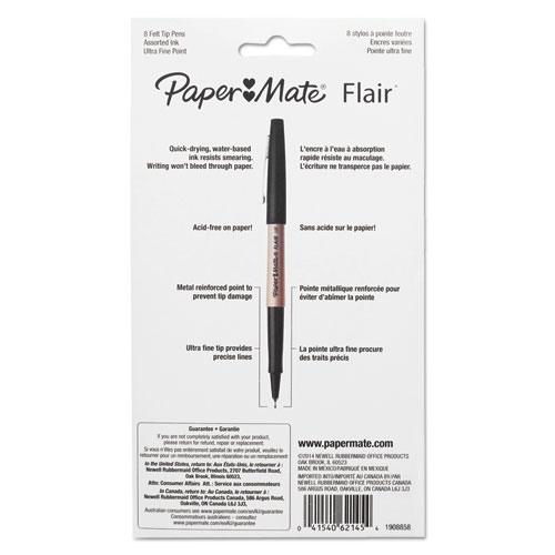 Product Details** Global Product Type Porous Point Pens Pen Style Stick Pen Tip Type Needle Pen Point Size Type Ultra-Fine Color Family Multicolor Erasable Ink No Refillable No Pen Sub-Brand & Product Family Flair® Felt Tip Pen Type Porous Point Pen Pen Point Size 0.4 mm Pen Ink Color(s) Assorted Pen Ink Color(s) Assortment Black,Blue,Green,Orange,Pink,Purple,Red,Turquoise Pen Barrel Color(s) Assorted Pen Barrel Color(s) Assortment Gray/Black,Gray/Blue,Gray/Green,Gray/Orange,Gray/Pink,Gray/Purple,Gray/Red,Gray/Turquoise Pen Cap Color(s) Assorted Pen Cap Color(s) Assortment Black,Blue,Green,Orange,Pink,Purple,Red,Turquoise Special Ink Properties Free-Flowing Liquid Ink Pen Grip Type Contoured Visible Ink Supply No Pocket Clip Indicator Yes Product Biodegradability in Days 0 Compliance Standards Box Tops for Education Pre-Consumer Recycled Content Percent 0% Post-Consumer Recycled Content Percent 0% Total Recycled Content Percent 0% Country Of Origin MX Carton Weight 6 lbs. Carton Pack Quantity 24 ST Pack Quantity 8 EA UPC 071641086739 UNSPSC 44121711 Shipping Weight & Item Dimensions Weight 0.175 lbs. Length 7.6 in Height 0.65 in Width 5.7 in