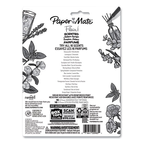 Product Details** Global Product Type Porous Point Pens Pen Style Stick Pen Tip Type Bullet Pen Point Size Type Medium Color Family Multicolor Erasable Ink No Refillable No Pen Sub-Brand & Product Family Flair® Scented Felt Tip Pen Type Porous Point Pen Pen Point Size 0.7 mm Pen Ink Color(s) Assorted Pen Ink Color(s) Assortment Birchwood Pine,Blue Jasmine,Calm Lavender,Cucumber Water,Eucalyptus Leaf,Fresh Mint,Goji Berry,Honeysuckle,Lemongrass,Morning Breeze,Orange Ginger,Pink Rose,Pomegranate Passion,Sandalwood,Spring Bluebell,Wild Berry Pen Barrel Color(s) Assorted Pen Barrel Color(s) Assortment Birchwood Pine,Blue Jasmine,Calm Lavender,Cucumber Water,Eucalyptus Leaf,Fresh Mint,Goji Berry,Honeysuckle,Lemongrass,Morning Breeze,Orange Ginger,Pink Rose,Pomegranate Passion,Sandalwood,Spring Bluebell,Wild Berry Pen Cap Color(s) Assorted Pen Cap Color(s) Assortment Birchwood Pine,Blue Jasmine,Calm Lavender,Cucumber Water,Eucalyptus Leaf,Fresh Mint,Goji Berry,Honeysuckle,Lemongrass,Morning Breeze,Orange Ginger,Pink Rose,Pomegranate Passion,Sandalwood,Spring Bluebell,Wild Berry Permanent/Washable Ink Permanent Archival-Quality Ink No Airplane-Safe Ink Yes Low-Viscosity Ink Yes Special Ink Properties Water-Based Liquid Pen Grip Type Smooth Visible Ink Supply No Pocket Clip Indicator Yes Product Biodegradability Indicator N Product Biodegradability in Days 0 Product Compostability Indicator N Compliance Standards ACMI AP Non-Toxic Certified, Conforms to ASTM D4236 Pre-Consumer Recycled Content Percent 0% Post-Consumer Recycled Content Percent 0% Total Recycled Content Percent 0% Special Features Nature Escape Scents Country Of Origin MX Carton Weight 8 lbs. Carton Pack Quantity 24 PK Pack Quantity 16 EA UPC 071641209831 UNSPSC 44121708 Shipping Weight & Item Dimensions Weight 0.28 lbs. Length 0.969 in Height 7.625 in Width 5.75 in