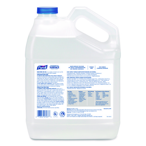 Product Details** Global Product Type Disinfectants/Cleaners Physical Form Liquid Scent Fragrance-Free Volume Capacity 1 gal Product Packaging Bottle Application Disinfectant/Cleaner Applicable Material Multi Surface Chemical Compound Ethyl Alcohol 29.4%,other ingredients 70.6% Dirt Types E.coli,Norovirus,Salmonella Product Biodegradability Indicator N Product Biodegradability in Days 0 Product Compostability Indicator N Compliance Standards EPA Reg. No. 84368-1,EPA List N,NSF D2 Certified,Kosher Pareve,U.S. EPA Design for the Environment Certified (DfE) Pre-Consumer Recycled Content Percent 0% Post-Consumer Recycled Content Percent 0% Total Recycled Content Percent 0% Country Of Origin US Carton Weight 36 lbs. Carton Pack Quantity 4 EA Pack Quantity 0 UPC 073852070378 UNSPSC 47131803 Shipping Weight & Item Dimensions Weight 35.9 lbs. Length 14.63 in Height 9.94 in Width 10.5 in