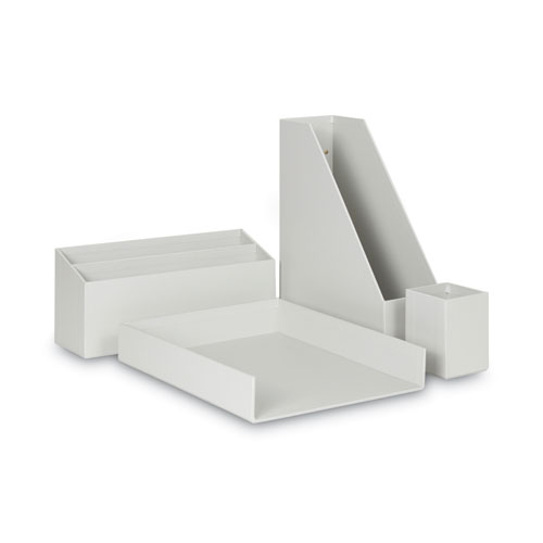 Keep organized in style with this all-inclusive desktop set from U Brands. The sturdy yet lightweight desk collection includes a pencil cup, paper tray, magazine holder, and storage bin. Bring a fashionable and functional look to your space, with sleek design that keeps your desk tidy and organized. Files and tools can be neatly stored, all while staying within arm’s reach.