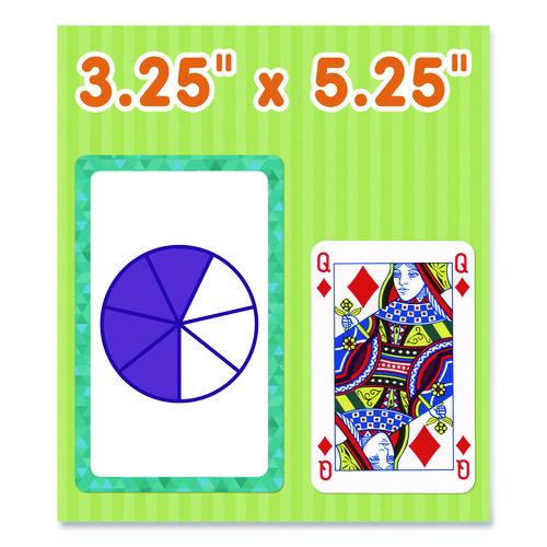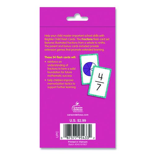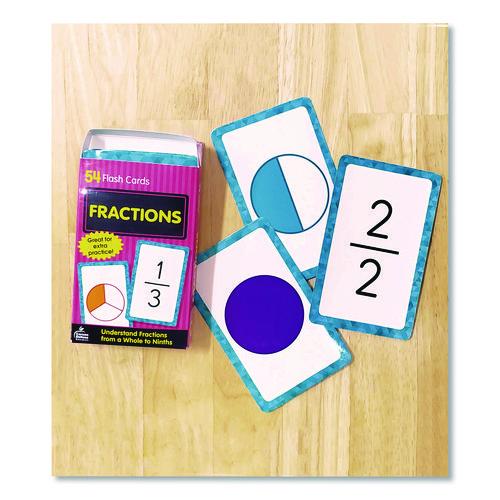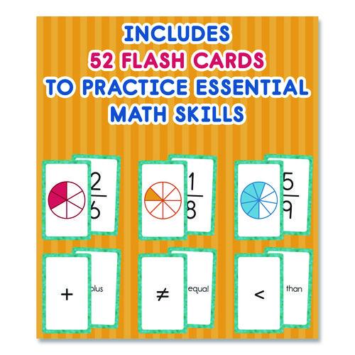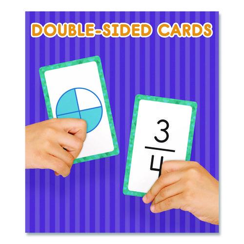 Fractions Flash Cards present an easy fun way for kids to practice essential math skills. This 54-card set includes 52 flash cards that illustrate fractions from a whole to ninths with images that represent each fraction to help students better understand what they look like. This set also includes a card that helps teach basic mathematical symbols, as well as a bonus game card. Flash cards allow kids to develop critical thinking, decision-making, turn-taking, other social skills while allowing them to learn in a hands-on way.