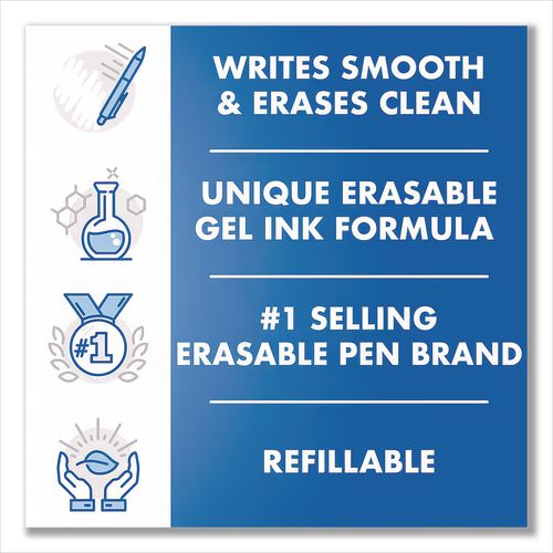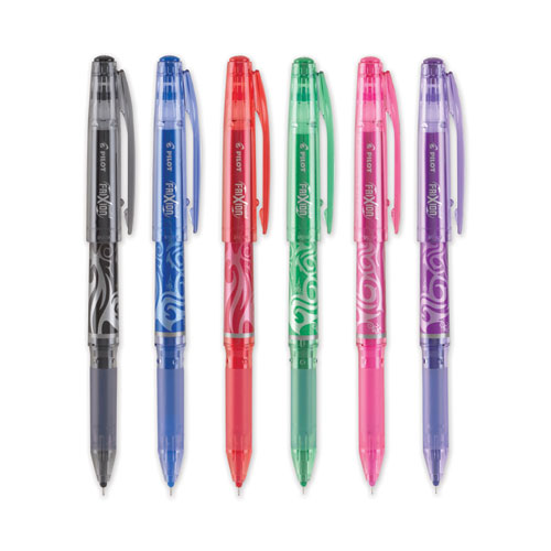 Product Details** Global Product Type Gel Pens Pen Style Stick Pen Tip Type Conical Pen Point Size Type Extra-Fine Color Family Multicolor Erasable Ink Yes Refillable Yes Pen Sub-Brand & Product Family FriXion® Ball Erasable Pen Type Gel Pen Pen Point Size 0.5 mm Pen Ink Color(s) Assorted Pen Ink Color(s) Assortment Black,Blue,Green,Pink,Purple,Red Pen Barrel Color(s) Assorted Pen Barrel Color(s) Assortment Black/Silver,Blue/Silver,Green/Silver,Pink/Silver,Purple/Silver,Red/Silver Pen Cap Color(s) Assorted Pen Cap Color(s) Assortment Smoke,Transparent Blue,Transparent Green,Transparent Pink,Transparent Purple,Transparent Red Low-Viscosity Ink No Special Ink Properties Water-Based Gel Pen Grip Type Dimpled Rubber Visible Ink Supply No Pocket Clip Indicator Yes Manufacturer Pen Refill # 77350,77351 Special Pen Packaging Plastic Pouch Product Biodegradability in Days 0 Package Includes (1) Plastic Pouch Pre-Consumer Recycled Content Percent 0% Post-Consumer Recycled Content Percent 0% Total Recycled Content Percent 0% Country Of Origin JP Carton Weight 9 lbs. Carton Pack Quantity 48 PK Pack Quantity 6 EA UPC 072838465245 UNSPSC 60121524 Shipping Weight & Item Dimensions Weight 0.19 lbs. Length 5.705 in Height 0.693 in Width 3.52 in
