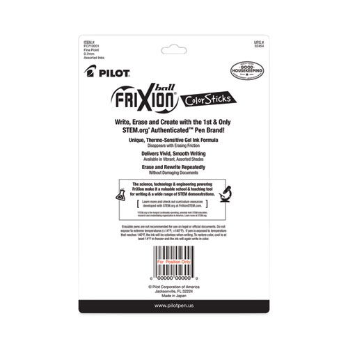 Product Details** Global Product Type Gel Pens Pen Style Stick Pen Tip Type Conical Pen Point Size Type Fine Color Family Multicolor Erasable Ink Yes Refillable No Pen Sub-Brand & Product Family FriXion ColorSticks Erasable Pen Type Gel Pen Pen Point Size 0.7 mm Pen Ink Color(s) Assorted Pen Ink Color(s) Assortment Black,Blue,Gray,Green,Magenta,Navy,Orange,Purple,Red,Salmon Pen Barrel Color(s) Assorted Pen Barrel Color(s) Assortment Black,Blue,Gray,Green,Magenta,Navy,Orange,Purple,Red,Salmon Pen Cap Color(s) Assorted Pen Cap Color(s) Assortment Clear/Black,Clear/Blue,Clear/Gray,Clear/Green,Clear/Magenta,Clear/Navy,Clear/Orange,Clear/Purple,Clear/Red,Clear/Salmon Low-Viscosity Ink No Special Ink Properties Water-Based Gel Pen Grip Type Ribbed Visible Ink Supply No Pocket Clip Indicator Yes Product Biodegradability Indicator N Product Biodegradability in Days 0 Product Compostability Indicator N Pre-Consumer Recycled Content Percent 0% Post-Consumer Recycled Content Percent 0% Total Recycled Content Percent 0% Country Of Origin JP Carton Weight 4 lbs. Carton Pack Quantity 12 PK Pack Quantity 10 EA UPC 072838324542 UNSPSC 60121524 Shipping Weight & Item Dimensions Weight 0.35 lbs. Length 8.38 in Height 0.75 in Width 5.75 in