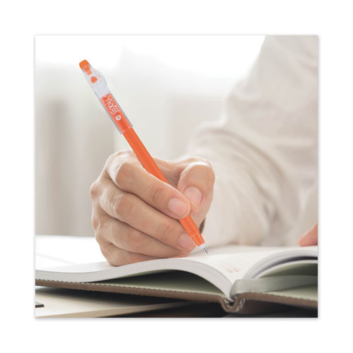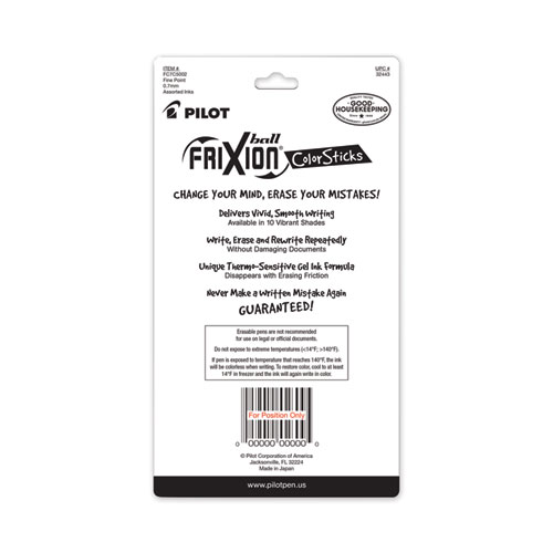 Product Details** Global Product Type Gel Pens Pen Style Stick Pen Tip Type Conical Pen Point Size Type Fine Color Family Multicolor Erasable Ink Yes Refillable No Pen Sub-Brand & Product Family FriXion ColorSticks Erasable Pen Type Gel Pen Pen Point Size 0.7 mm Pen Ink Color(s) Assorted Pen Ink Color(s) Assortment Blue,Green,Orange,Purple,Turquoise Pen Barrel Color(s) Assorted Pen Barrel Color(s) Assortment Blue,Green,Orange,Purple,Turquoise Pen Cap Color(s) Assorted Pen Cap Color(s) Assortment Clear/Blue,Clear/Green,Clear/Orange,Clear/Purple,Clear/Turquoise Low-Viscosity Ink No Special Ink Properties Water-Based Gel Pen Grip Type Ribbed Visible Ink Supply No Pocket Clip Indicator Yes Product Biodegradability in Days 0 Pre-Consumer Recycled Content Percent 0% Post-Consumer Recycled Content Percent 0% Total Recycled Content Percent 0% Country Of Origin JP Carton Weight 7 lbs. Carton Pack Quantity 48 PK Pack Quantity 5 EA UPC 072838151452 UNSPSC 60121524 Shipping Weight & Item Dimensions Weight 0.1 lbs. Length 7.7 in Height 0.6 in Width 4.3 in
