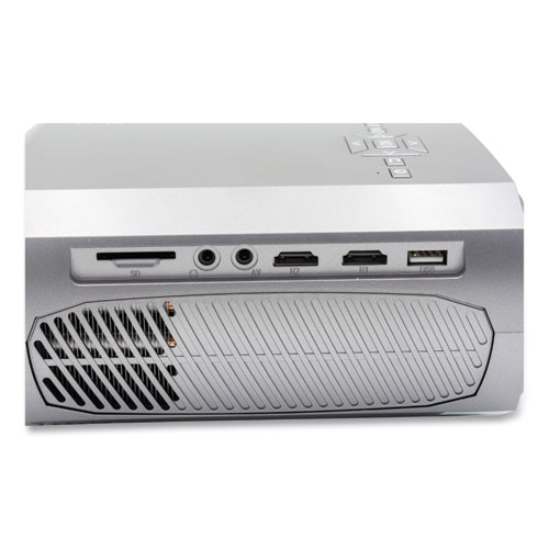 Native 1080P projector with multimedia player. Projection size from 50″ to 200″. Integrated 3 W speaker. Manual focus adjustment. Long LED lifetime of 40,000 hours. Connectable with computer, notebook, tablet, smartphone and gaming consoles via AV, VGA, or HDMI. Playback of video, photo and audio Files from USB, SD or external hard disk. Usable with remote control. LCD/LED projection system. Lens multichip composite coating optical lens.