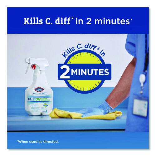 Now you can use bleach in more places than ever before. Clorox Healthcare Fuzion Cleaner Disinfectant combines the power of bleach with excellent aesthetics for broad use in your facility. Made with revolutionary hypochlorous acid bleach technology that is fast acting and easy on many surfaces, this pH neutral formula kills C. difficile spores in two minutes (A precleaning step is required to kill Clostridioides difficile and Candida auris. Follow special instructions for cleaning prior to disinfection), the fastest kill time available, and eliminates more than 60 pathogens, when used as directed. This one step disinfecting spray for healthcare settings has proven efficacy against outbreak causing viruses, emerging viral pathogens, MRSA and VRE. Use in hospitals, medical facilities, dental offices, veterinary offices and long-term care facilities.