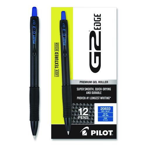 Product Details** Global Product Type Gel Pens Pen Style Retractable Pen Tip Type Conical Pen Point Size Type Fine Color Family Blue Erasable Ink No Refillable Yes Pen Sub-Brand & Product Family G2® Edge Premium Pen Type Gel Pen Pen Point Size 0.7 mm Pen Ink Color(s) Blue Pen Barrel Color(s) Black/Blue Permanent/Washable Ink Washable Archival-Quality Ink Yes Airplane-Safe Ink Yes Low-Viscosity Ink Yes Special Ink Properties Acid Free,Quick-Dry Pen Grip Type Textured Contoured Rubber Visible Ink Supply No Pocket Clip Indicator Yes Manufacturer Pen Refill # 77241 Product Biodegradability Indicator N Product Biodegradability in Days 0 Product Compostability Indicator N Pre-Consumer Recycled Content Percent 0% Post-Consumer Recycled Content Percent 0% Total Recycled Content Percent 0% Country Of Origin JP Carton Weight 4 lbs. Carton Pack Quantity 12 DZ Pack Quantity 0 UPC 072838208330 UNSPSC 44121704 Shipping Weight & Item Dimensions Weight 0.3 lbs. Length 1.3 in Height 5.7 in Width 2.7 in