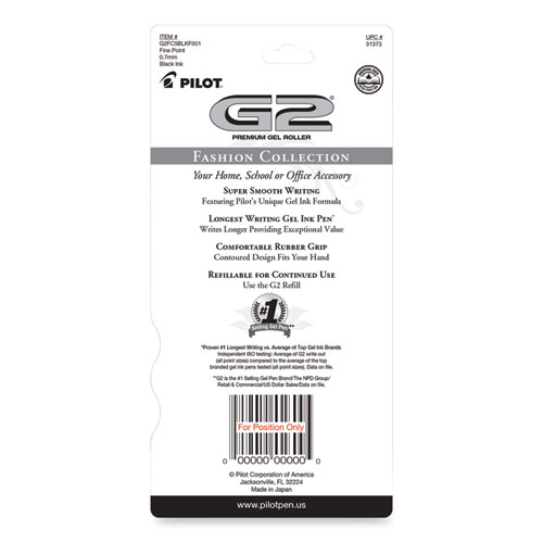 Fashion and function combine for the optimal writing experience in the G2 gel ink pen, providing an exceptional writing experience. Proven to write longer vs. the average of branded competitors, G2 Fashion also has smooth gel ink that glides across the page and a comfortable, latex-free rubber grip. Perfect for everyday tasks. Refillable for continued use.