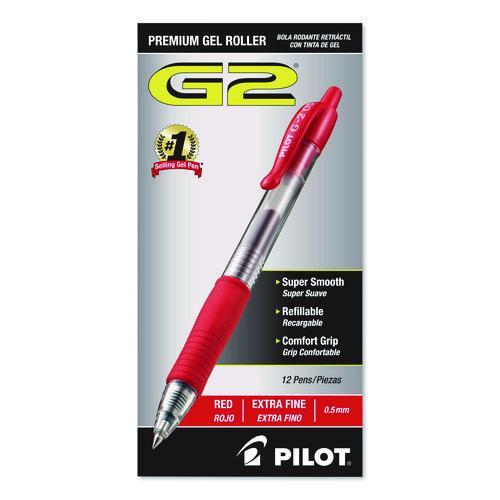 Product Details** Global Product Type Gel Pens Pen Style Retractable Pen Tip Type Conical Pen Point Size Type Extra-Fine Color Family Red Erasable Ink No Refillable Yes Pen Sub-Brand & Product Family G2® Premium Pen Type Gel Pen Pen Point Size 0.5 mm Pen Ink Color(s) Red Pen Barrel Color(s) Smoke/Red Low-Viscosity Ink No Special Ink Properties Water-Based Gel Pen Grip Type Contoured Latex-Free Rubber Visible Ink Supply Yes Pocket Clip Indicator Yes Manufacturer Pen Refill # 77234 Product Biodegradability in Days 0 Pre-Consumer Recycled Content Percent 0% Post-Consumer Recycled Content Percent 0% Total Recycled Content Percent 0% Disclaimer Statement Determined “Longest Lasting” via Independent ISO testing. Results on file with Pilot Corporation of America. Country Of Origin JP Carton Weight 26 lbs. Carton Pack Quantity 72 DZ Pack Quantity 0 UPC 072838310040 UNSPSC 60121524 Shipping Weight & Item Dimensions Weight 0.312 lbs. Length 5.8 in Height 1.2 in Width 2.9 in