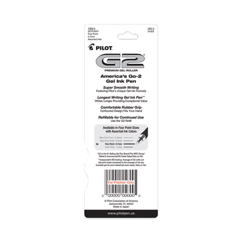 Product Details** Global Product Type Gel Pens Pen Style Retractable Pen Tip Type Conical Pen Point Size Type Fine Color Family Multicolor Erasable Ink No Refillable Yes Pen Sub-Brand & Product Family G2® Premium Pen Type Gel Pen Pen Point Size 0.7 mm Pen Ink Color(s) Assorted Pen Ink Color(s) Assortment Black,Blue,Red Pen Barrel Color(s) Assorted Pen Barrel Color(s) Assortment Smoke/Black,Smoke/Blue,Smoke/Red Low-Viscosity Ink No Special Ink Properties Water-Based Gel Pen Grip Type Contoured Latex-Free Rubber Visible Ink Supply Yes Pocket Clip Indicator Yes Manufacturer Pen Refill # 77240,77241,77242 Product Biodegradability in Days 0 Pre-Consumer Recycled Content Percent 0% Post-Consumer Recycled Content Percent 0% Total Recycled Content Percent 0% Disclaimer Statement Determined “Longest Lasting” via Independent ISO testing. Results on file with Pilot Corporation of America. Country Of Origin JP Carton Weight 5 lbs. Carton Pack Quantity 48 PK Pack Quantity 3 EA UPC 072838310231 UNSPSC 60121524 Shipping Weight & Item Dimensions Weight 0.087 lbs. Length 7.4 in Height 0.5 in Width 2.7 in