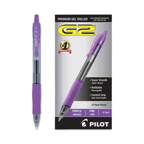 Product Details** Global Product Type Gel Pens Pen Style Retractable Pen Tip Type Conical Pen Point Size Type Fine Color Family Purple Erasable Ink No Refillable Yes Pen Sub-Brand & Product Family G2® Premium Pen Type Gel Pen Pen Point Size 0.7 mm Pen Ink Color(s) Purple Pen Barrel Color(s) Smoke/Purple Low-Viscosity Ink No Special Ink Properties Water-Based Gel Pen Grip Type Contoured Latex-Free Rubber Visible Ink Supply Yes Pocket Clip Indicator Yes Manufacturer Pen Refill # 77244 Product Biodegradability in Days 0 Pre-Consumer Recycled Content Percent 0% Post-Consumer Recycled Content Percent 0% Total Recycled Content Percent 0% Disclaimer Statement Determined “Longest Lasting” via Independent ISO testing. Results on file with Pilot Corporation of America. Country Of Origin JP Carton Weight 25 lbs. Carton Pack Quantity 72 DZ Pack Quantity 0 UPC 072838310293 UNSPSC 60121524 Shipping Weight & Item Dimensions Weight 0.31 lbs. Length 5.8 in Height 1.25 in Width 2.8 in