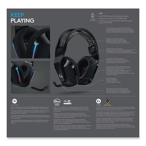 Meet G733, a gaming headset designed to suit your style. Embrace total wireless with 2.4 GHz LIGHTSPEED wireless, featuring up to 20 m of range and up to 29 hours of battery life. Customize how you look and sound in G HUB with dual-zone, front-facing LIGHTSYNC RGB and Blue VOICE real-time voice filters. G733 features advanced audio technologies, including 40 mm PRO-G audio drivers, internal acoustic chambers, and DTS Headphone: X 2.0. Play your way with a comfortable, reversible headband, dual-layer memory foam earcups, and a lightweight headset that weighs just 278 g.