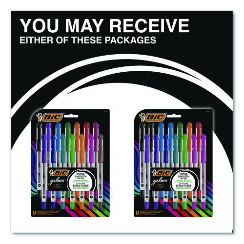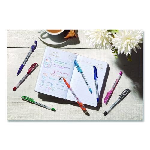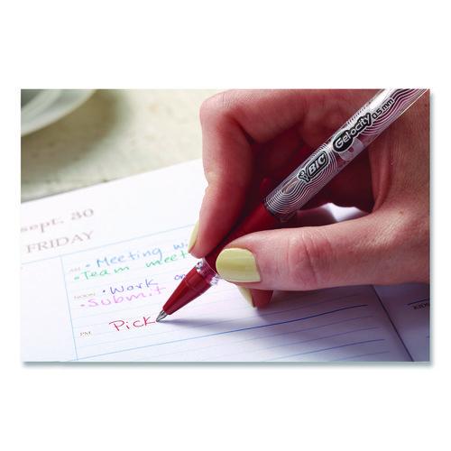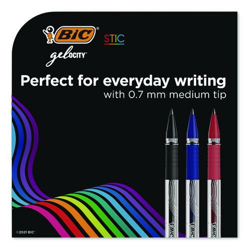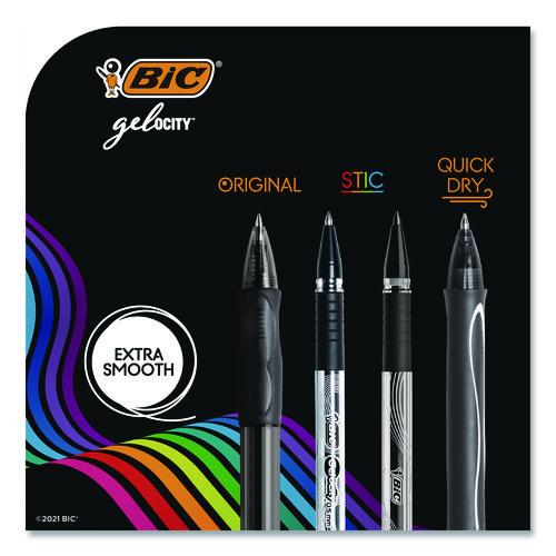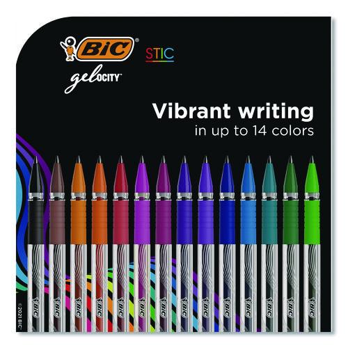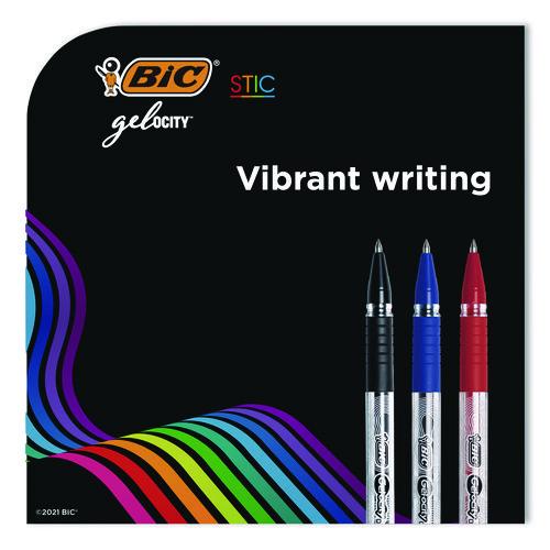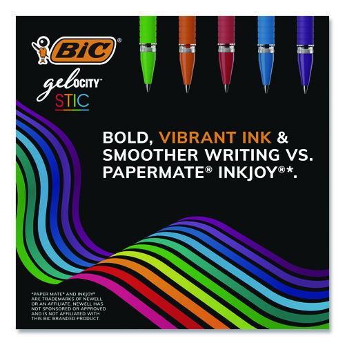 Enjoy a super-smooth writing experience with BIC® Gel-ocity™ STIC Gel Pens. Ideal for note-taking, journaling and a variety of everyday writing activities, these pens feature a unique, smear-free gel ink that dries in as little as five seconds, while their easy-flow system and high-quality points ensure fluid, precise, nearly effortless writing. Their smooth round barrels with rubberized grips rest comfortably in your hand, and their translucent design with ink-color-matched accents make it easy to grab the right color while allowing you to keep an eye on your remaining ink supply. Choose Gel-ocity™ STIC Gel Pens; they’re sure to make a striking impression at work, at school and at home.