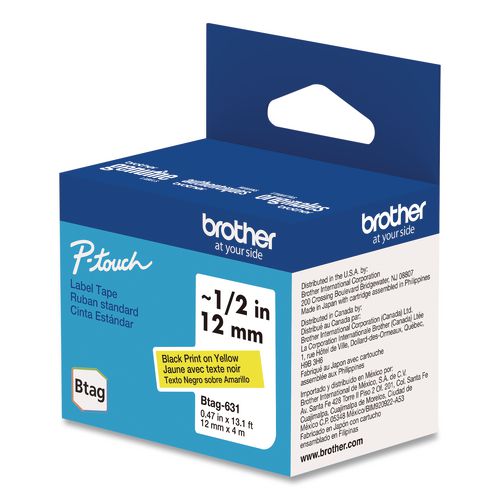 Product Details** Global Product Type Label Maker Multipurpose Labels Machine Compatibility Brother-P-Touch® PT-N10, PT-N20, PT-N25BT Label Size – text 0.47″ x 13.1 ft Label Color(s) Yellow Text/Label Colors Black Print on Yellow Tape Adhesive Weatherproof For Use With Brother P-Touch® Label Maker PT-N10, PT-N20, PT-N25BT Product Biodegradability Indicator N Product Biodegradability in Days 0 Product Compostability Indicator N Pre-Consumer Recycled Content Percent 0% Post-Consumer Recycled Content Percent 0% Total Recycled Content Percent 0% Country Of Origin JP Carton Weight 4 lbs. Carton Pack Quantity 24 EA Pack Quantity 0 UPC 012502675051 UNSPSC 55121600 Shipping Weight & Item Dimensions Weight 0.2 lbs. Length 2.5 in Height 1.8 in Width 2.1 in