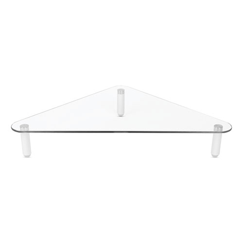 Corner design is perfect for cubicles. Ample space to place accessories and store keyboard underneath. Strong tempered glass platform. Non-skid feet keep the stand in place. Elegant contemporary design.