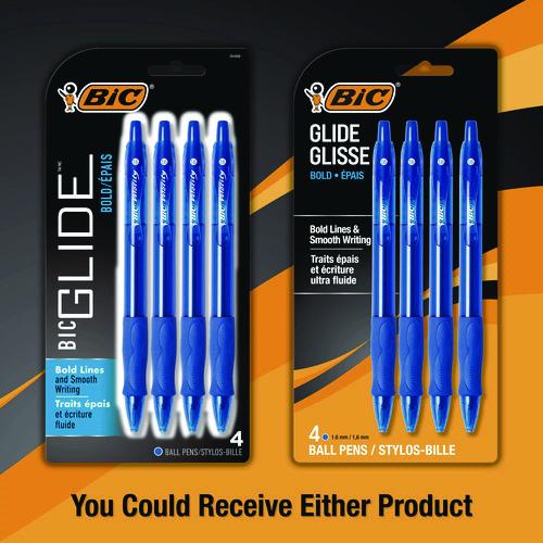 Product Details** Global Product Type Ballpoint Pens Pen Style Retractable Pen Tip Type Conical Pen Point Size Type Bold Color Family Blue Erasable Ink No Refillable Yes Pen Sub-Brand & Product Family GLIDE Bold Pen Type Ballpoint Pen Pen Point Size 1.6 mm Pen Ink Color(s) Blue Pen Barrel Color(s) Translucent Blue Airplane-Safe Ink Yes Low-Viscosity Ink No Pen Grip Type Contoured Rubber Visible Ink Supply Yes Pocket Clip Indicator Yes Product Biodegradability in Days 0 Pre-Consumer Recycled Content Percent 0% Post-Consumer Recycled Content Percent 0% Total Recycled Content Percent 0% Country Of Origin FR Carton Weight 6 lbs. Carton Pack Quantity 36 PK Pack Quantity 4 EA UPC 070330184510 UNSPSC 44121704 Shipping Weight & Item Dimensions Weight 0.111 lbs. Length 7.63 in Height 0.661 in Width 3.754 in