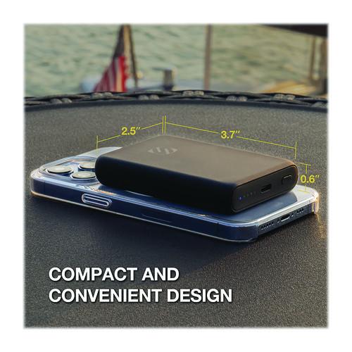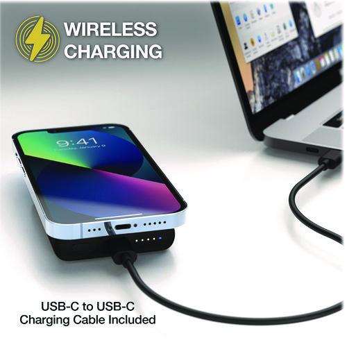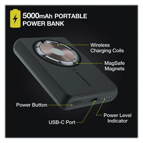 Portable 5000 mAh MagSafe compatible magnetic power bank provides wireless and wired charging options. Dimensions: 3.7″H x 2.5″W x 0.6″D. Includes a 11.8″ USB Type-C to USB Type-C cable. Certified for safety and compatibility to provide Qi-compatible devices with up to 10 W of fast wireless charging power. Shuts the Qi wireless charger element down when something other than a device’s Qi charging area is detected. Specially designed Qi wireless charging area magnetically attaches to and wirelessly charges an iPhone 12 and iPhone 13 with a MagSafe. Sequenced LED battery indicator light lets you know how much power you have left. Works with iPhone 8 and later models (USB Type-C to Lightning cable is required), Samsung Galaxy, Google Pixel, and other Qi-enabled or USB Type-C devices.