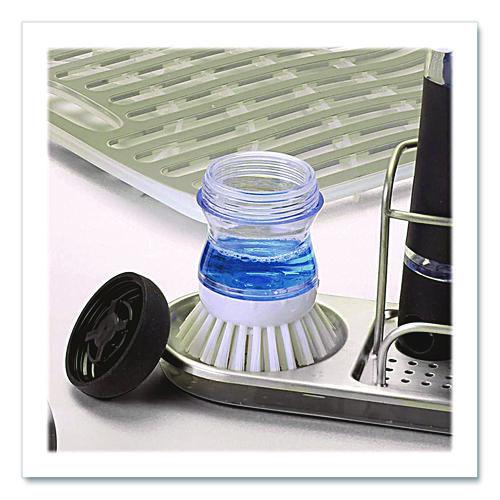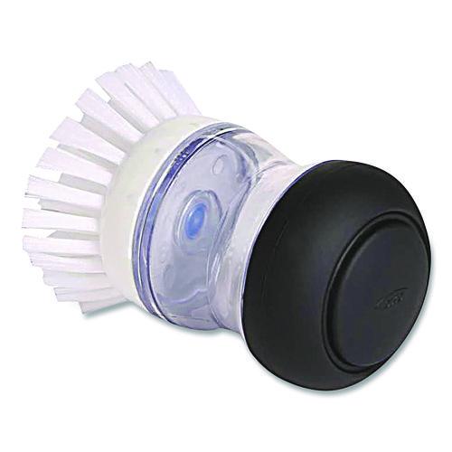 Dispense soap with a light push of a button with this OXO Good Grips soap brush. It provides more leverage for scrubbing and soap on demand. The contoured shape provides optimal comfort, and the durable nylon bristles are safe for nonstick cookware. This OXO Good Grips soap dispensing palm brush has a soft non-slip grip.