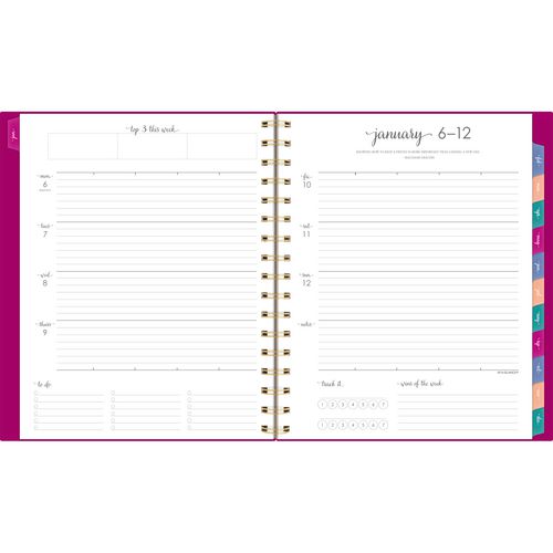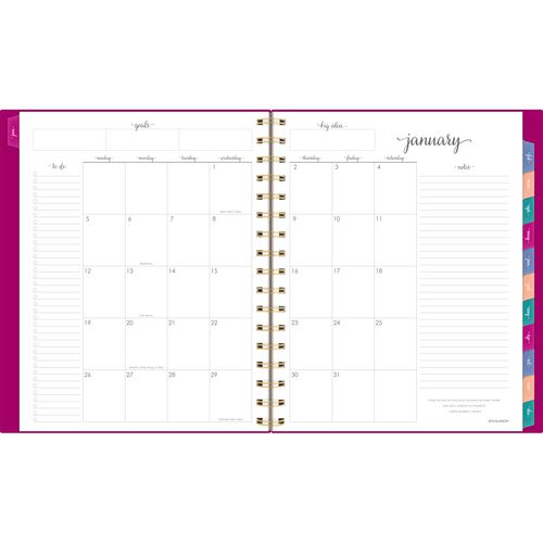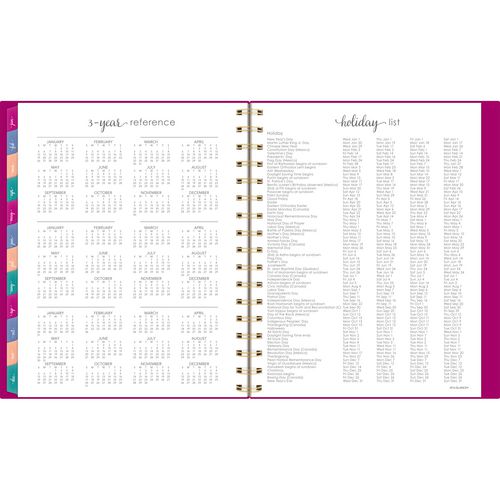 Product Details** Global Product Type Appointment Book/Personal Organizers Dated Yes Academic Year No Calendar Format Weekly,Monthly Edition Year 2025 to 2026 Calendar Term 13-Month (Jan to Jan) Binding Type Wire-O Color Family Purple Refillable No Calendar Spread Format One Week per Two-Page Spread,One Month per Two-Page Spread Julian Dates No Size (Bound-Side First) 8.88 x 7.69 Binding Details Twin-Wire: Flexible Cover Cover Color(s) Purple/Gold Cover Material(s) Poly Binding Color(s) Gold Appointment Ruling Open Scheduling Separate Sections “Connect With” Contact Pages,Four-Year Holiday List,”Looking Ahead” Future Planning Pages,Quad Ruled Notes Pages,Standard Ruled Notes Pages,Three-Year Reference Calendar Sheet Color(s) White Pocket Details (1) Two-Sided Storage Pocket Reversible No Seasonal Availability Yes Age Recommendation Ages 12 and Up Product Biodegradability Indicator N Product Biodegradability in Days 0 Product Compostability Indicator N Package Includes (1) Sheet of Repositionable Color-Coding & Labeling Stickers Pre-Consumer Recycled Content Percent 0% Post-Consumer Recycled Content Percent 0% Total Recycled Content Percent 0% Country Of Origin VN Carton Weight 12 lbs. Carton Pack Quantity 12 EA Pack Quantity 0 UPC 038576356122 UNSPSC 44112004 Shipping Weight & Item Dimensions Weight 0.992 lbs. Length 0.688 in Height 8.875 in Width 7.688 in