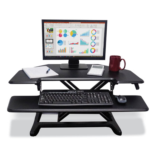 Transform any sit-down desk into a standing desk. Easily adjustable to your preferred height, this corner model ensures the correct ergonomic placement of monitors, keyboard, mouse, and other accessories for optimal comfort. Sleek and sturdy wood construction with a durable laminate coating provides years of use.
