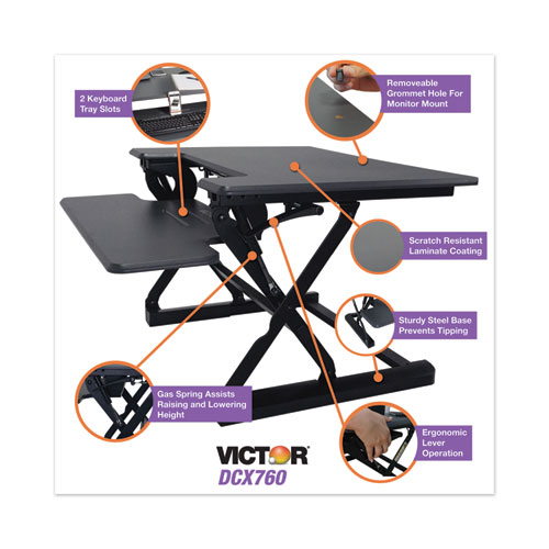 Product Details** Global Product Type Desktop-Mounted Sit/Stand Workstations Worksurface Shape Rectangular Color Family Gray Pedestal Count 0 Keyboard/Mouse Platform Indicator Yes CPU Holder/Platform Indicator No Number of Drawers 0 Series Name Victor® DCX700 High Rise Collection Worksurface/Base Color Gray/Black Worksurface Material Wood Worksurface Width 36″ Worksurface Depth 23″ Edge Detail Profile Half Beveled Base Material Steel Overall Width (Max) 36″ Overall Depth (Max) 31.25″ Overall Height (Min) 5.25″ Overall Height (Max) 20″ Lift Range (Max) 20″ Number of Shelves 0 Shelf Width 36″ Shelf Depth 14″ Screen Size (Max) 27″ Keyboard/Mouse Platform Color Gray Keyboard Platform Width (Min) 35″ Keyboard Platform Width (Max) 36″ Keyboard Platform Depth (Min) 13.75″ Keyboard Platform Depth (Max) 14″ Weight (Fully Assembled) 49 lb Product Biodegradability Indicator N Product Biodegradability in Days 0 Product Compostability Indicator N Package Includes Assembly Hardware,Assembly Instructions,Assembly Tools Pre-Consumer Recycled Content Percent 0% Post-Consumer Recycled Content Percent 0% Total Recycled Content Percent 0% Country Of Origin VN Carton Weight 59 lbs. Carton Pack Quantity 1 EA Pack Quantity 0 UPC 014751007607 UNSPSC 56111500 Shipping Weight & Item Dimensions Weight 59.4 lbs. Length 25.5 in Height 8 in Width 38.5 in Warranty Manufacturer’s limited three-year warranty.