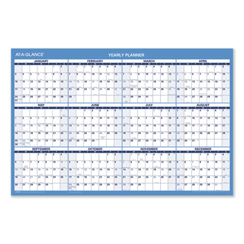 Product Details** Global Product Type Wall Calendars Dated Yes Academic Year No Calendar Format Yearly Edition Year 2026 Calendar Term 12-Month (Jan to Dec) Color Family White Refillable No Calendar Spread Format Side One (Horizontal): One Year per Page,Side Two (Horizontal): Open Notes/Planning Julian Dates Yes Size (Bound-Side First) 36 x 24 Sheet Color(s) White/Blue Reversible Yes Seasonal Availability Yes Product Biodegradability Indicator N Product Biodegradability in Days 0 Product Compostability Indicator N Package Includes (1) Wet Erase Marker Pre-Consumer Recycled Content Percent 0% Post-Consumer Recycled Content Percent 0% Total Recycled Content Percent 0% Footnote 1 Block Size: 1.25 x 1.25 Special Features Two-Sided-Side One: Horizontal orientation (Jan to Dec). Side Two: Notes Space. Country Of Origin US Carton Weight 4 lbs. Carton Pack Quantity 6 EA Pack Quantity 0 UPC 038576399556 UNSPSC 44112002 Shipping Weight & Item Dimensions Weight 0.375 lbs. Length 25.127 in Height 2.875 in Width 2.875 in