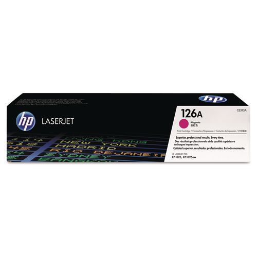 Product Details** Global Product Type Toner/Toner Cartridges OEM/Compatible OEM Supply Type Toner Device Types Laser Printer Color(s) Magenta Page-Yield 1,000 Market Indicator (Cartridge Number) HP 126A Remanufactured No For Use With HP LaserJet Pro 100 Color MFP M175nw, Pro CP1025nw, TopShot LaserJet Pro M275 MFP Product Biodegradability in Days 0 Post-Consumer Recycled Content Percent 0% Total Recycled Content Percent 14% Country Of Origin JP Carton Weight 2 lbs. Carton Pack Quantity 1 EA Pack Quantity 0 UPC 884962161159 UNSPSC 44103103 Shipping Weight & Item Dimensions Weight 1.1 lbs. Length 14.29 in Height 3.27 in Width 3.39 in