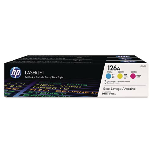 Product Details** Global Product Type Toner/Toner Cartridges OEM/Compatible OEM Supply Type Toner Device Types Laser Printer Color(s) Cyan,Magenta,Yellow Page-Yield 1,000 Market Indicator (Cartridge Number) HP 126A Remanufactured No For Use With HP LaserJet Pro 100 Color MFP M175nw, Pro CP1025nw, TopShot LaserJet Pro M275 MFP Product Biodegradability in Days 0 Post-Consumer Recycled Content Percent 0% Total Recycled Content Percent 14% Country Of Origin JP Carton Weight 4 lbs. Carton Pack Quantity 3 EA Pack Quantity 0 UPC 886112385606 UNSPSC 44103103 Shipping Weight & Item Dimensions Weight 3.3 lbs. Length 9.8 in Height 3.39 in Width 14.29 in