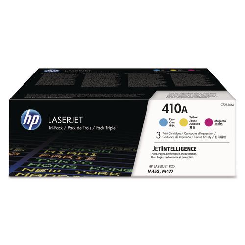 HP 410A, (CF251A-M) 3-Pack Cyan/Magenta/Yellow Original LaserJet Toner CartridgesHP 410A, (CF251A-M) 3-Pack Cyan/Magenta/Yellow Original LaserJet Toner Cartridges