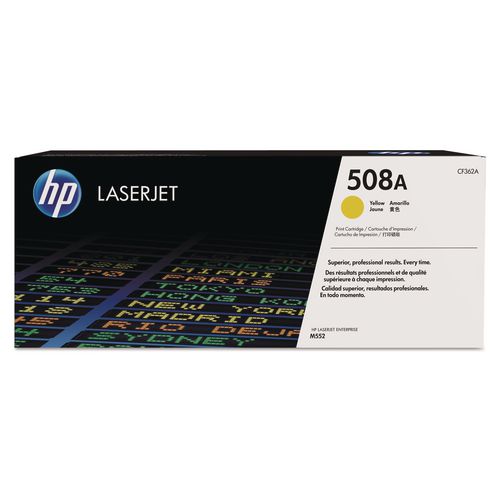 Product Details** Global Product Type Toner/Toner Cartridges OEM/Compatible OEM Supply Type Toner Device Types Laser Printer Color(s) Yellow Page-Yield 5,000 Market Indicator (Cartridge Number) HP 508A Remanufactured No For Use With HP Color LaserJet M553 Series Product Biodegradability in Days 0 Post-Consumer Recycled Content Percent 0% Total Recycled Content Percent 14% Country Of Origin JP Carton Weight 2 lbs. Carton Pack Quantity 1 EA Pack Quantity 0 UPC 888793237588 UNSPSC 44103103 Shipping Weight & Item Dimensions Weight 1.89 lbs. Length 5.79 in Height 6.34 in Width 15.55 in Warranty Manufacturer’s limited one-year warranty.