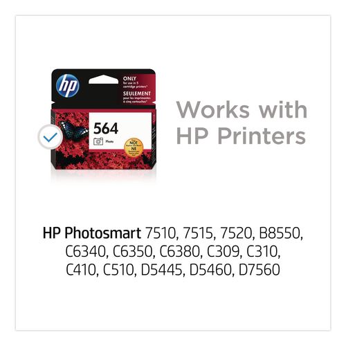 Product Details** Global Product Type Ink/Ink Cartridges OEM/Compatible OEM Supply Type Ink Device Types Inkjet Printer Color(s) Photo Black Page-Yield 130 Market Indicator (Cartridge Number) HP 564 Remanufactured No For Use With HP DeskJet 3520, 3521, 3522, 3526,OfficeJet 4610, 4620, 4622, 6000, 6500, 7000,Photosmart 5512, 5514, 5515, 5520, 5525, 6510, 6520, 6525, 7510, 7515, 7520, B8550, C6340, C6350, D7560, Plus, Premium, Premium Fax, Premium TouchSmart Product Biodegradability in Days 0 Pre-Consumer Recycled Content Percent 0% Post-Consumer Recycled Content Percent 0% Total Recycled Content Percent 0% Footnote 1 Approximate yield of 4″ x 6″ color photos Country Of Origin CN Carton Weight 4 lbs. Carton Pack Quantity 24 EA Pack Quantity 0 UPC 883585829736 UNSPSC 44103105 Shipping Weight & Item Dimensions Weight 0.11 lbs. Length 4.52 in Height 0.94 in Width 3.94 in