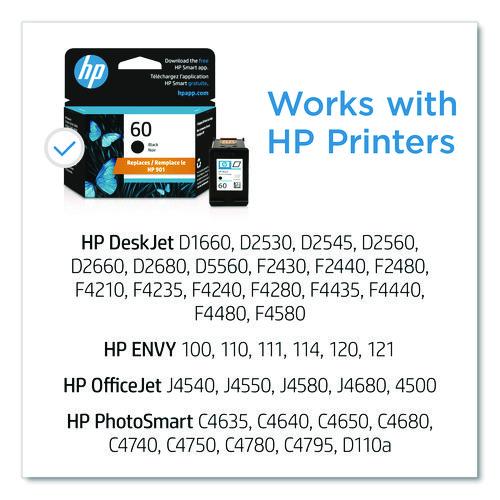 Product Details** Global Product Type Ink/Ink Cartridges OEM/Compatible OEM Supply Type Ink Device Types Inkjet Printer Color(s) Black Page-Yield 200 Market Indicator (Cartridge Number) HP 60 Remanufactured No For Use With HP Deskjet D1660, D2530, D2545, D2560, D2660, D2680, D5560, F2430, F2440, F2480, F4210, F4235, F4240, F4280, F4435, F4440, F4480, F4580,ENVY 100, 110, 111, 114, 120, 121,Photosmart C4635, C4640, C4650, C4680, C4740, C4750, C4780, C4795 e-All-in-One Product Biodegradability in Days 0 Post-Consumer Recycled Content Percent 58% Total Recycled Content Percent 62% Country Of Origin CN Carton Weight 4 lbs. Carton Pack Quantity 24 EA Pack Quantity 0 UPC 883585702534 UNSPSC 44103105 Shipping Weight & Item Dimensions Weight 0.112 lbs. Length 1.43 in Height 4.05 in Width 4.49 in
