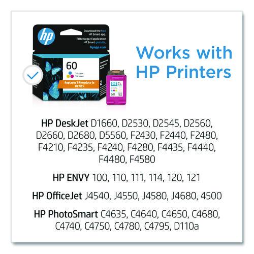 Product Details** Global Product Type Ink/Ink Cartridges OEM/Compatible OEM Supply Type Ink Device Types Inkjet Printer Color(s) Tri-Color Page-Yield 165 Market Indicator (Cartridge Number) HP 60 Remanufactured No For Use With HP Deskjet D1660, D2530, D2545, D2560, D2660, D2680, D5560, F2430, F2440, F2480, F4210, F4235, F4240, F4280, F4435, F4440, F4480, F4580,ENVY 100, 110, 111, 114, 120, 121,Photosmart C4635, C4640, C4650, C4680, C4740, C4750, C4780, C4795 e-All-in-One Product Biodegradability in Days 0 Post-Consumer Recycled Content Percent 49% Total Recycled Content Percent 52% Country Of Origin CN Carton Weight 4 lbs. Carton Pack Quantity 24 EA Pack Quantity 0 UPC 883585702558 UNSPSC 44103105 Shipping Weight & Item Dimensions Weight 0.128 lbs. Length 1.43 in Height 5.53 in Width 4.57 in