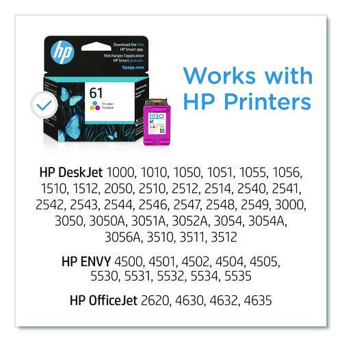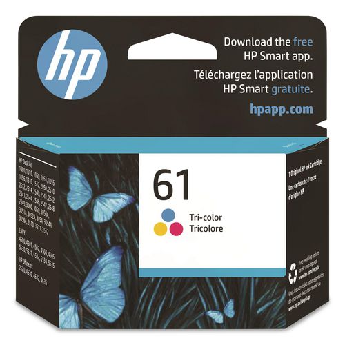 Product Details** Global Product Type Ink/Ink Cartridges OEM/Compatible OEM Supply Type Ink Device Types Inkjet Printer Color(s) Tri-Color Page-Yield 150 Market Indicator (Cartridge Number) HP 61 Remanufactured No For Use With HP DeskJet 1000, 1010, 1012, 1050, 1051, 1055, 1056, 1510, 1512, 1514, 2050, 2510, 2512, 2514, 2540, 2541, 2542, 2543, 2544, 2546, 2547, 2549, 3000, 3050, 3050A, 3051A, 3052A, 3054, 3054A, 3056A, 3510, 3511, 3512,ENVY 4500, 4501, 4502, 4504, 4505, 5530, 5531, 5532, 5535,OfficeJet 2620, 4630, 4631, 4632, 4635 Product Biodegradability in Days 0 Post-Consumer Recycled Content Percent 54% Total Recycled Content Percent 57% Country Of Origin CN Carton Weight 4 lbs. Carton Pack Quantity 24 EA Pack Quantity 0 UPC 884962983614 UNSPSC 44103105 Shipping Weight & Item Dimensions Weight 0.13 lbs. Length 1.43 in Height 4.05 in Width 4.49 in