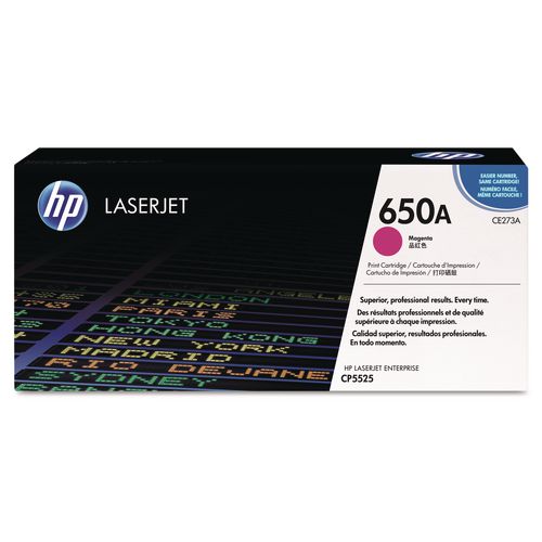 Product Details** Global Product Type Toner/Toner Cartridges OEM/Compatible OEM Supply Type Toner Device Types Laser Printer Color(s) Magenta Page-Yield 15,000 Market Indicator (Cartridge Number) HP 650A Remanufactured No For Use With HP Color LaserJet Enterprise CP5525 Series, M750 Series Product Biodegradability in Days 0 Total Recycled Content Percent 17% Country Of Origin CN Carton Weight 6 lbs. Carton Pack Quantity 1 EA Pack Quantity 0 UPC 884962161197 UNSPSC 44103103 Shipping Weight & Item Dimensions Weight 5.75 lbs. Length 7.4 in Height 8.86 in Width 19.37 in