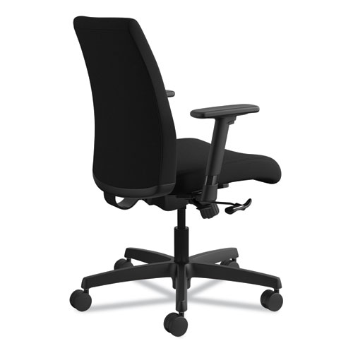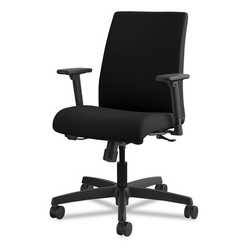 Product Details** Global Product Type Office Chairs Color Family Black Arms Included Yes Pneumatic Seat Height Adjustment Yes Tilt Tension/Tilt Lock Yes Integral Lumbar Support No Seat Surface Material Family Fabric Recommended Application Area(s) General Office & Task Seat Color Black Back Color Black Arm Type Padded T-Bar Weight Capacity Supports Up to 300 lb Back Height Adjustment Yes Seat Glide Mechanism No Knee Tilt No Synchronized Knee Tilt No Dual-Action Tilt No Posture Lock No Multi-Task Control No Asynchronous Control No Dual-Clutch Posture Control No Variable Synchro-Tilt No Arm Adjustability Height,Width Armrest Color Black Armrest Material Polyurethane Distance Between Arms 17″ to 19.5″ Arm Height From Seat 8″ to 11″ Overall Width Maximum 27″ Overall Depth Maximum 27″ Overall Height Maximum 41″ Seat Width Maximum 19″ Seat Depth Maximum 15.75″ Seat Height Minimum 17″ Seat Height Maximum 21.5″ Seat Surface Material 100% Polyester Back Width Maximum 17.5″ Back Height Minimum 18.75″ Back Height Maximum 21.75″ Back Surface Material 100% Polyester Back Surface Material Family Fabric Base/Frame Color Black Base/Frame Material(s) Plastic Caster/Glide Details Five Casters Product Biodegradability in Days 0 Compliance Standards Level 2 Certified,Meets or Exceeds ANSI/BIFMA Standards,Meets or Exceeds ISTA Performance Standards,SCS Indoor Advantage Certified,SCS Indoor Advantage Gold Certified Pre-Consumer Recycled Content Percent 3% Post-Consumer Recycled Content Percent 38% Total Recycled Content Percent 41% Disclaimer Statement Casters supplied with this chair are not suitable for all floor types. Country Of Origin MX Carton Weight 51 lbs. Carton Pack Quantity 1 EA Pack Quantity 0 UPC 089191212867 UNSPSC 56112104 Shipping Weight & Item Dimensions Weight 51 lbs. Length 25.75 in Height 23 in Width 32.5 in Warranty Backed by the HON Full Lifetime Warranty.